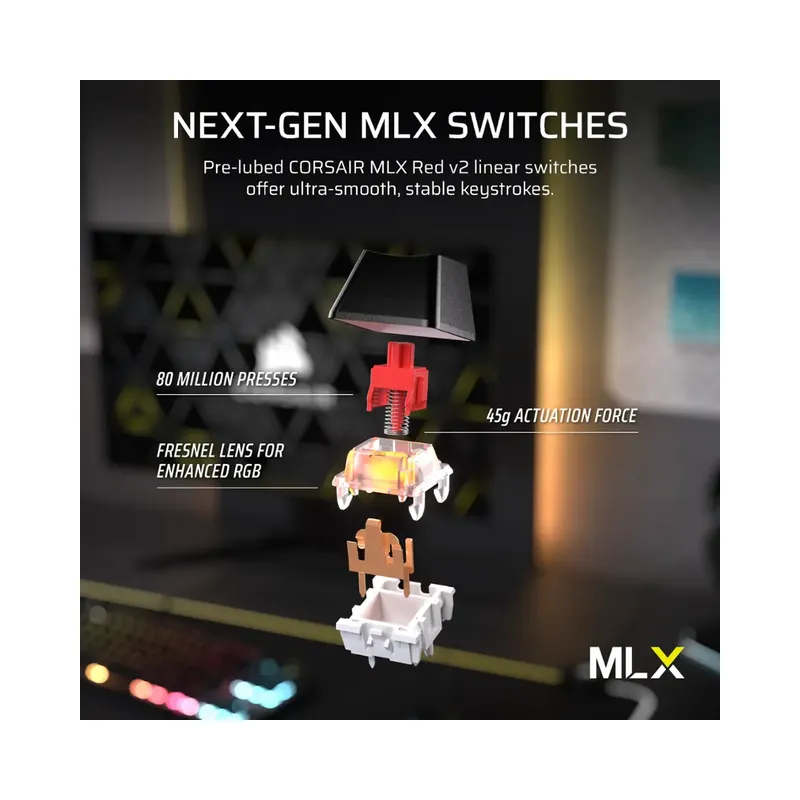 - Key Switches: CORSAIR MLX Red v2 Linear Switches (Pre-lubed)
