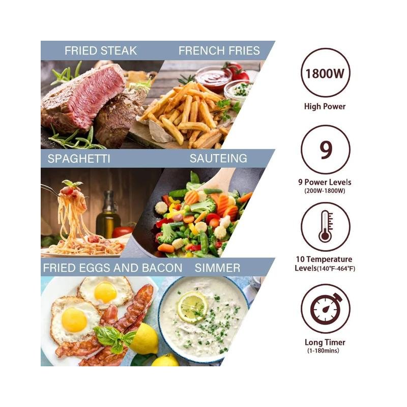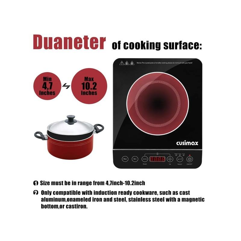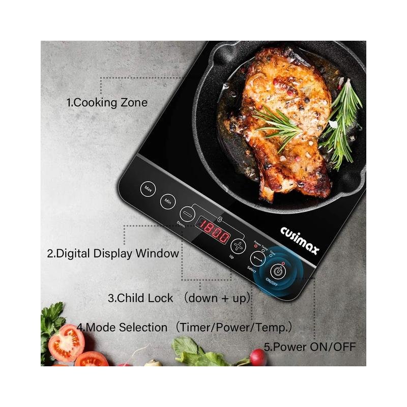 The Cusimax induction cooker offers 9 power levels (200W-1800W) and 10 temperature settings (140°F – 464°F), providing fast and efficient heating. Whether you’re frying, boiling, or steaming, this cooktop adapts to your cooking needs with ease.