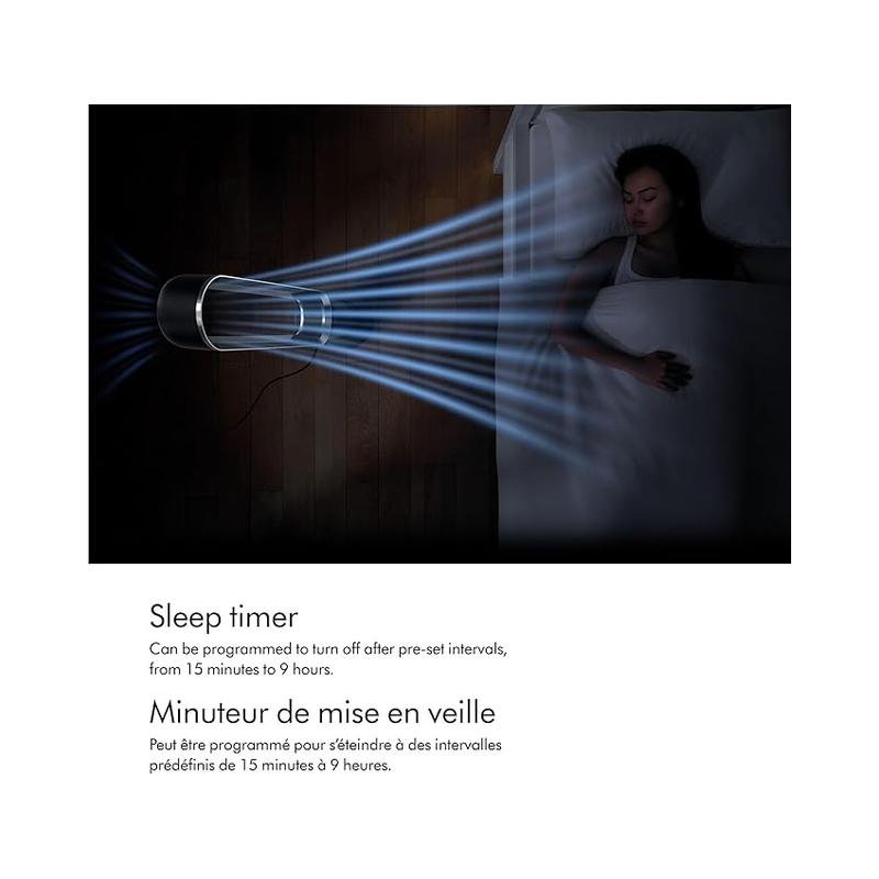 - Sleep timer lets you program the fan to shut off after pre-set intervals ranging from 15min-9hrs