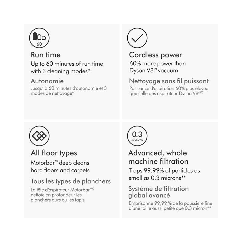 - Advanced, whole-machine filtration traps 99.99% of fine dust as small as 0.3 microns** 160% suction power Compared to a Dyson V8 vacuum