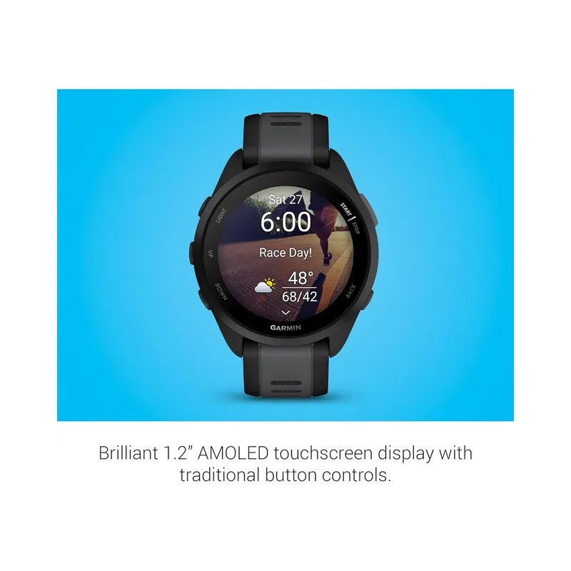 - Easy-to-use running smartwatch with built-in GPS for pace/distance and wrist-based heart rate; brilliant AMOLED touchscreen display with traditional button controls; lightweight design in 43 mm size