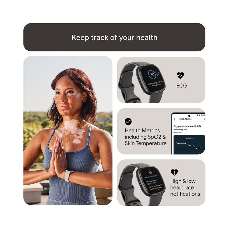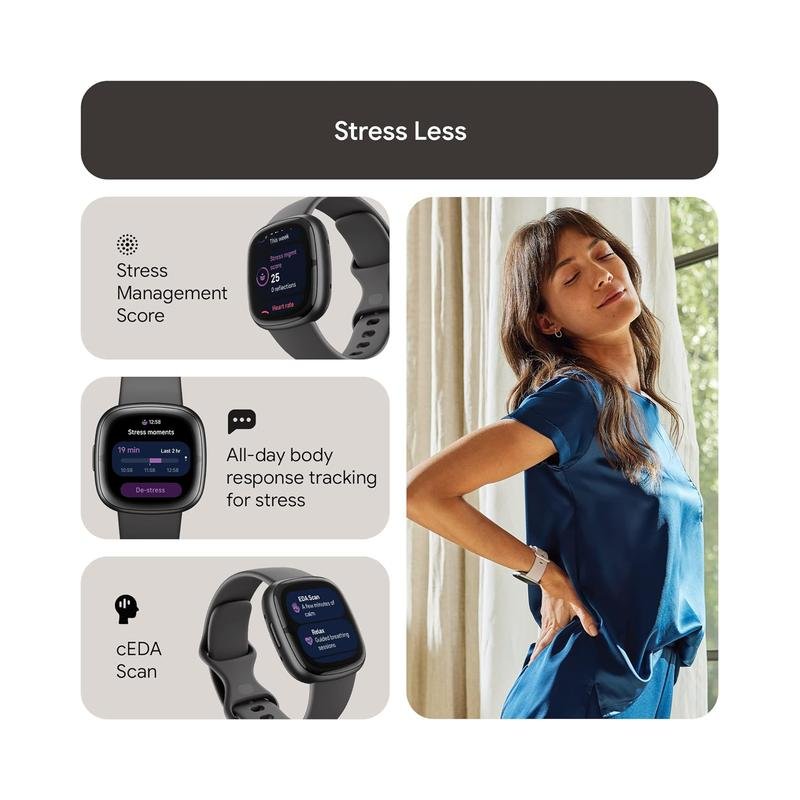 - Manage stress and live healthier: all-day stress detection with cEDA and daily stress management score, ECG app for atrial fibrillation assessment, irregular heart rhythm notifications spO2, health metrics dashboard, menstrual health tracking and mindfulness content