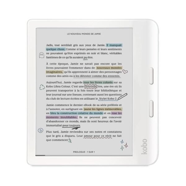 The Kobo Libra Colour takes eReading to the next level with its stunning 7″ E Ink Kaleido™ 3 display, offering a full-color experience that enhances reading with vibrant illustrations, book covers, and notes. It’s an excellent choice for those who love to annotate, organize, and highlight their thoughts in color, especially with Kobo Stylus 2 compatibility.