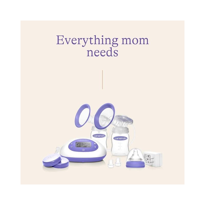 What’s Included: Pump unit, 25mm ComfortFit® flanges, 2 Lansinoh® 5oz collection bottles with nipples and storage lids, 2 diaphragms with caps, valves, 3 connection tubes with a Y-connector, an AC adapter, a tote bag, and an instruction booklet.