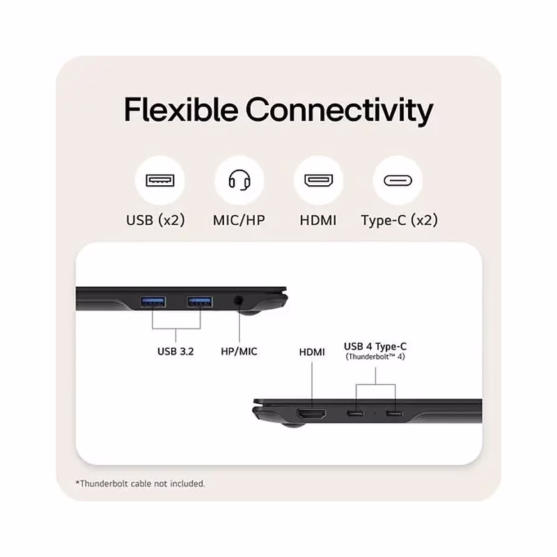 • 2 × USB-C / Thunderbolt 4 (Power Delivery & DisplayPort)