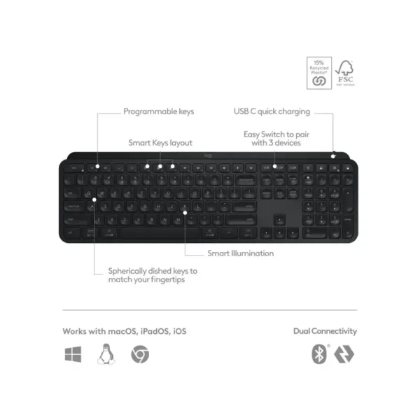 - Keyboard Features: Spherically dished keys, smart illumination, programmable keys, Smart Keys layout, Easy Switch to pair with up to 3 devices