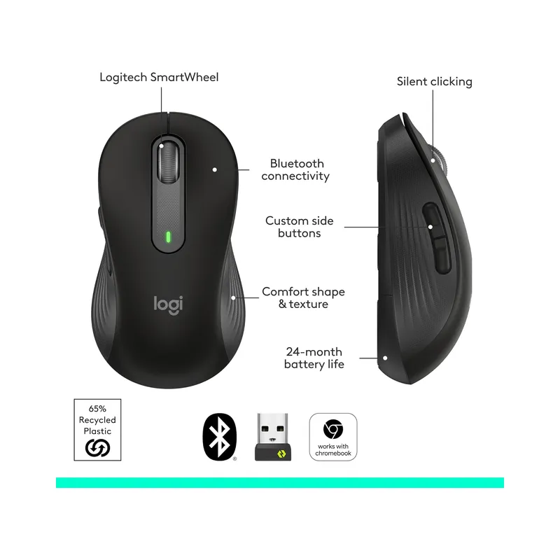 The Signature M650 L in Black (Graphite) is made with at least 65% post-consumer recycled plastic. Other colors also feature eco-conscious materials