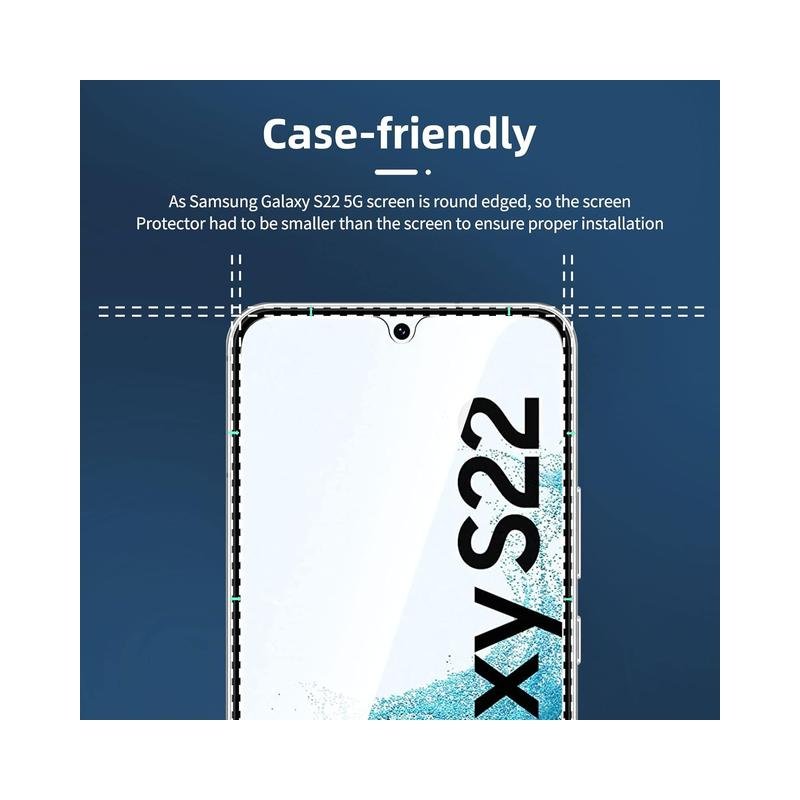 - The screen protector provides the maximum protection for the Samsung Galaxy S22 5G touchscreen. The space between Samsung Galaxy S22 5G and the screen protector enables the proper space for the installation of most phone cases.