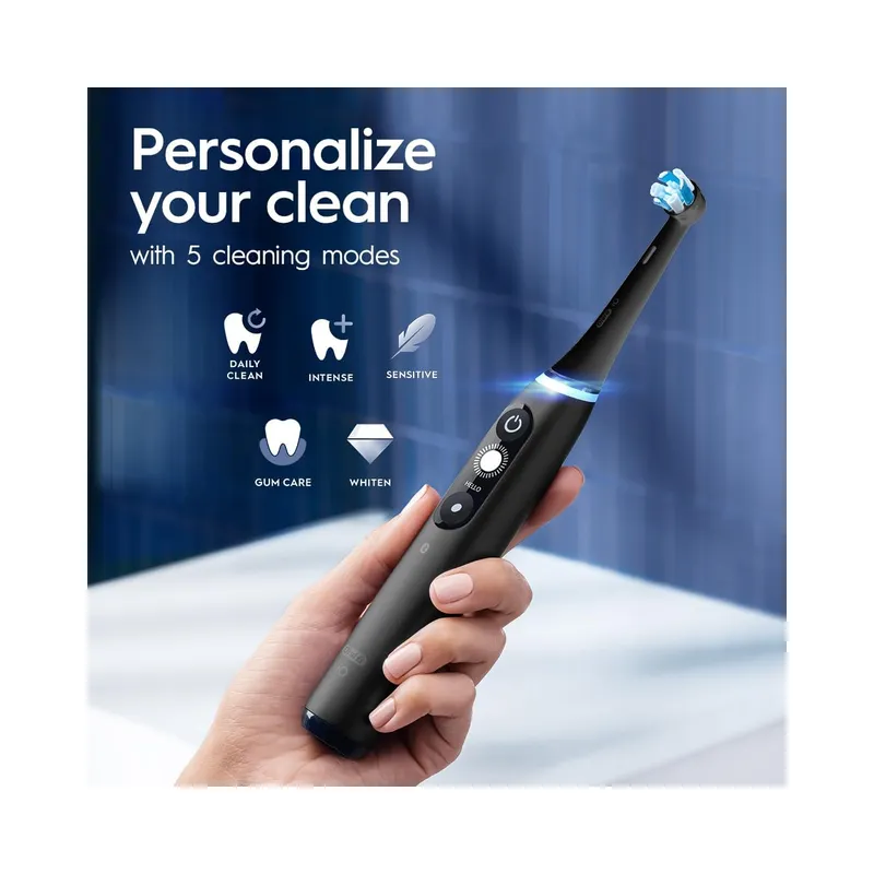 Choose from 5 cleaning modes directly on the smart display. It also tracks brushing time, reminds you to replace your brush head, and shows battery status.