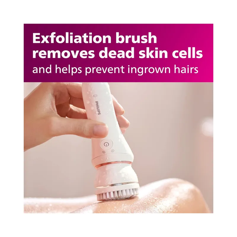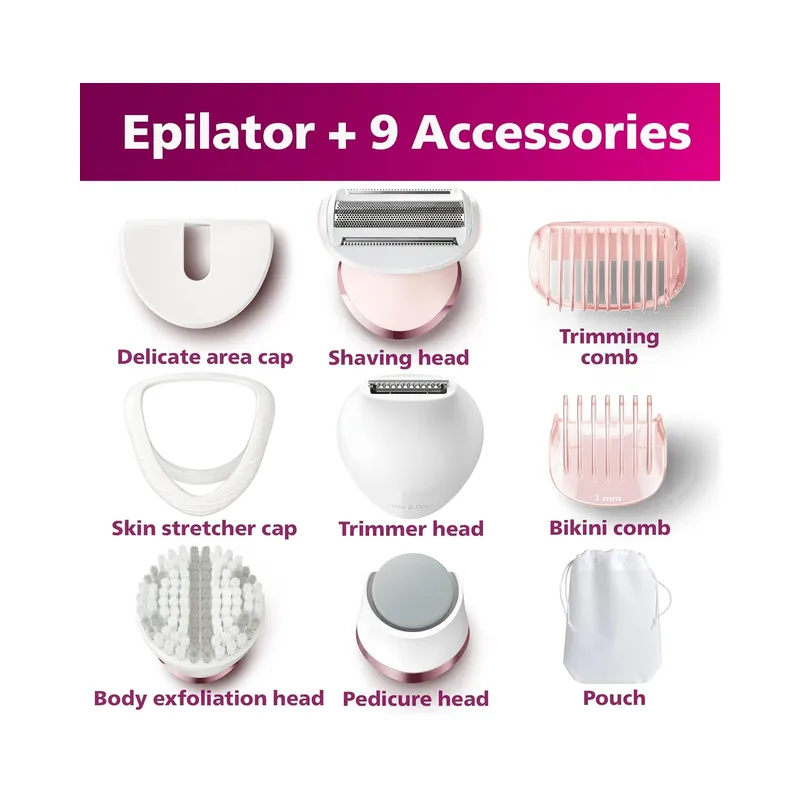 This versatile grooming kit includes multiple attachments: an epilator, shaving head, trimming comb, bikini trimmer head and comb, body exfoliation brush to remove dead skin cells, and a pedicure foot file for smooth feet. It also comes with delicate and optimal contact caps, a cleaning brush, and a storage pouch.