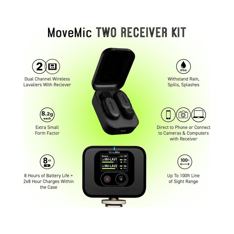 Shure MoveMic Two Kit – Pro Wireless Lavalier Microphones with Camera Receiver, MV-Two-KIT-Z7 – Black (Brand New)