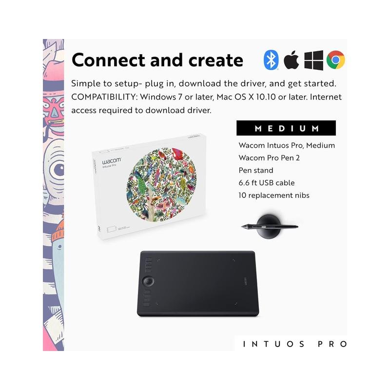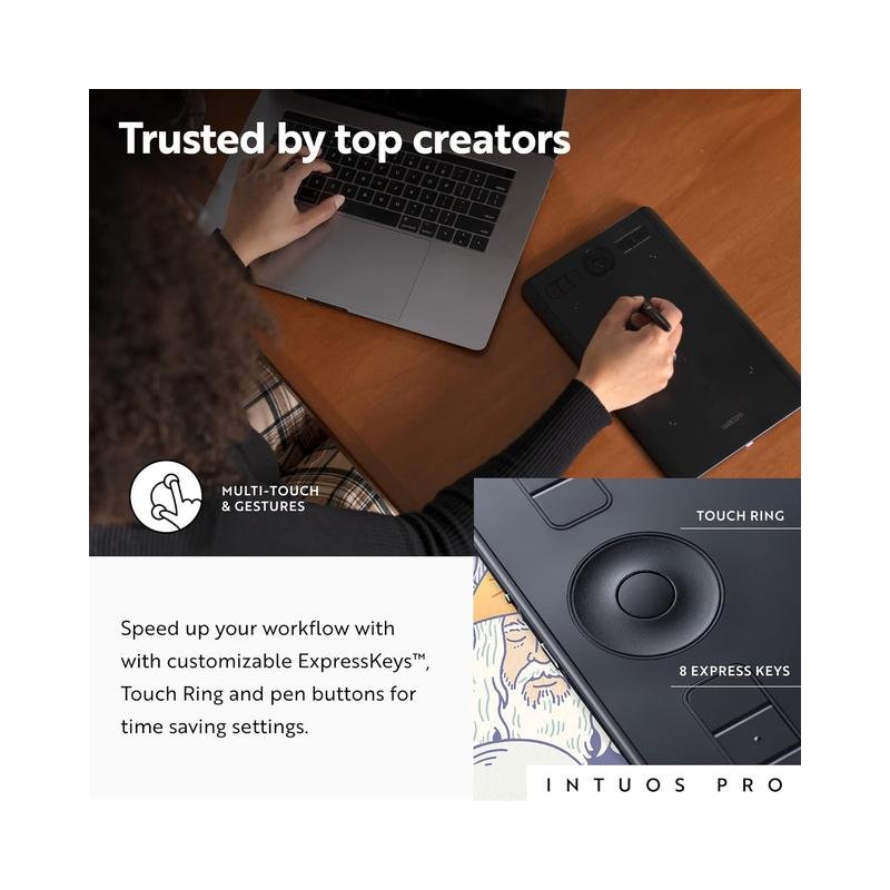 Boost productivity with customizable ExpressKeys, radial menus, multi-touch gestures, and pen side switches, allowing for a seamless workflow. The tablet supports both USB and Bluetooth connectivity, ensuring flexible setup options.